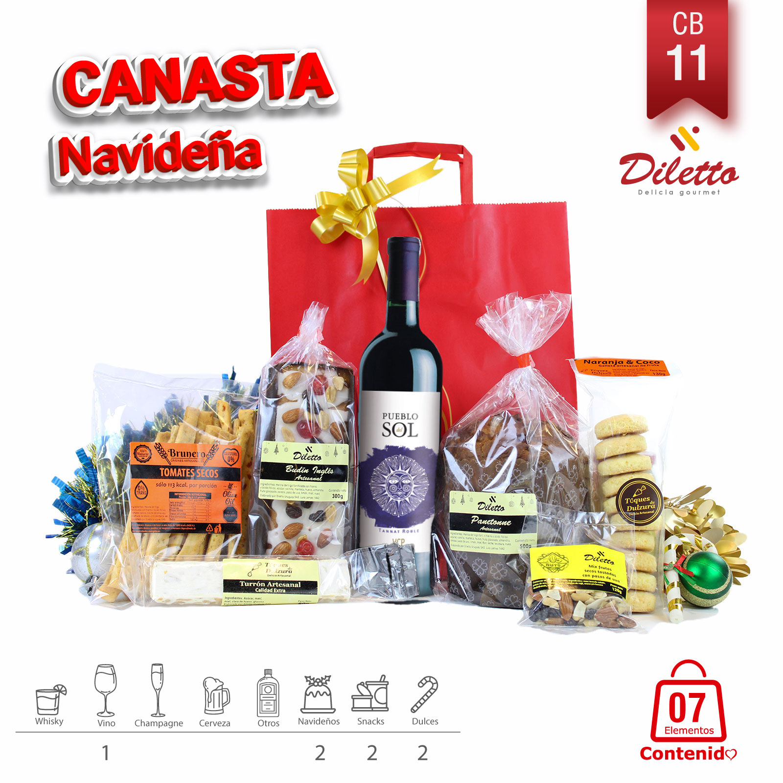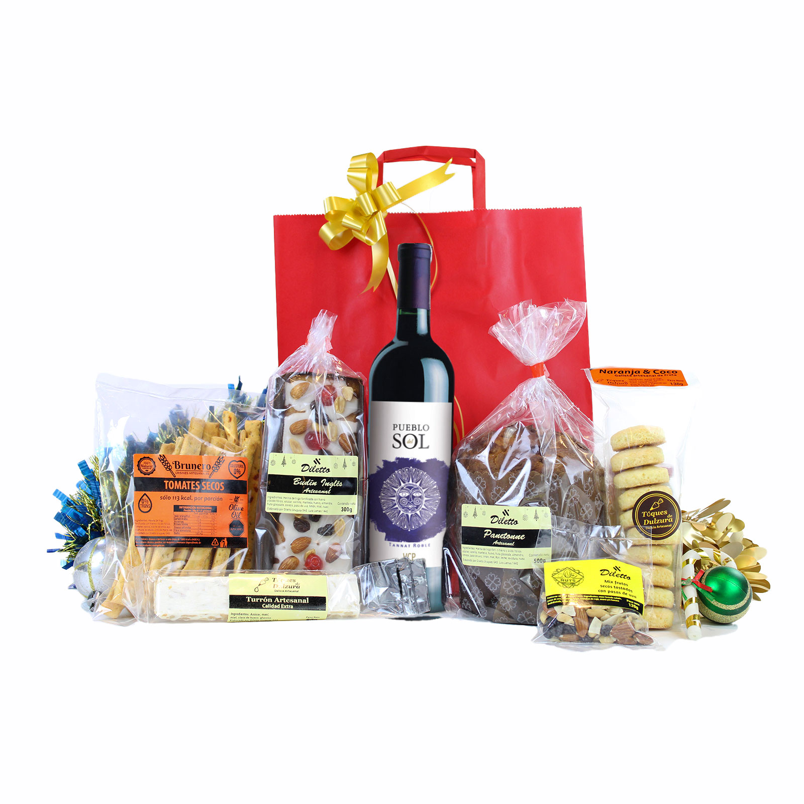 Descubre la esencia navideña con nuestra Bolsa Navideña CB11. Delicias artesanales que incluyen Panettone, Budín Inglés y más, acompañadas de un selecto Vino Cabernet Sauvignon Roble. Presentada en una bolsa ecológica con motivos festivos.