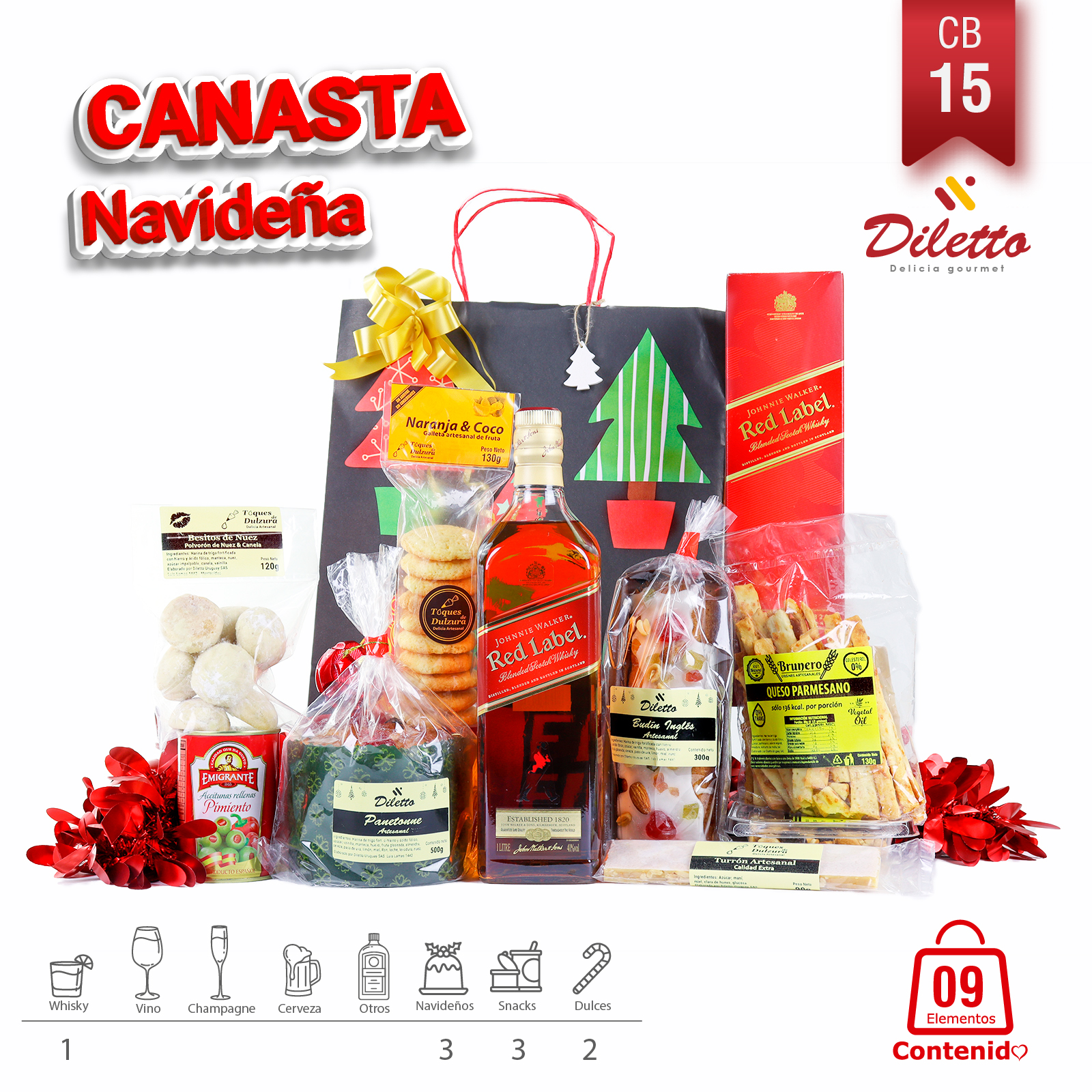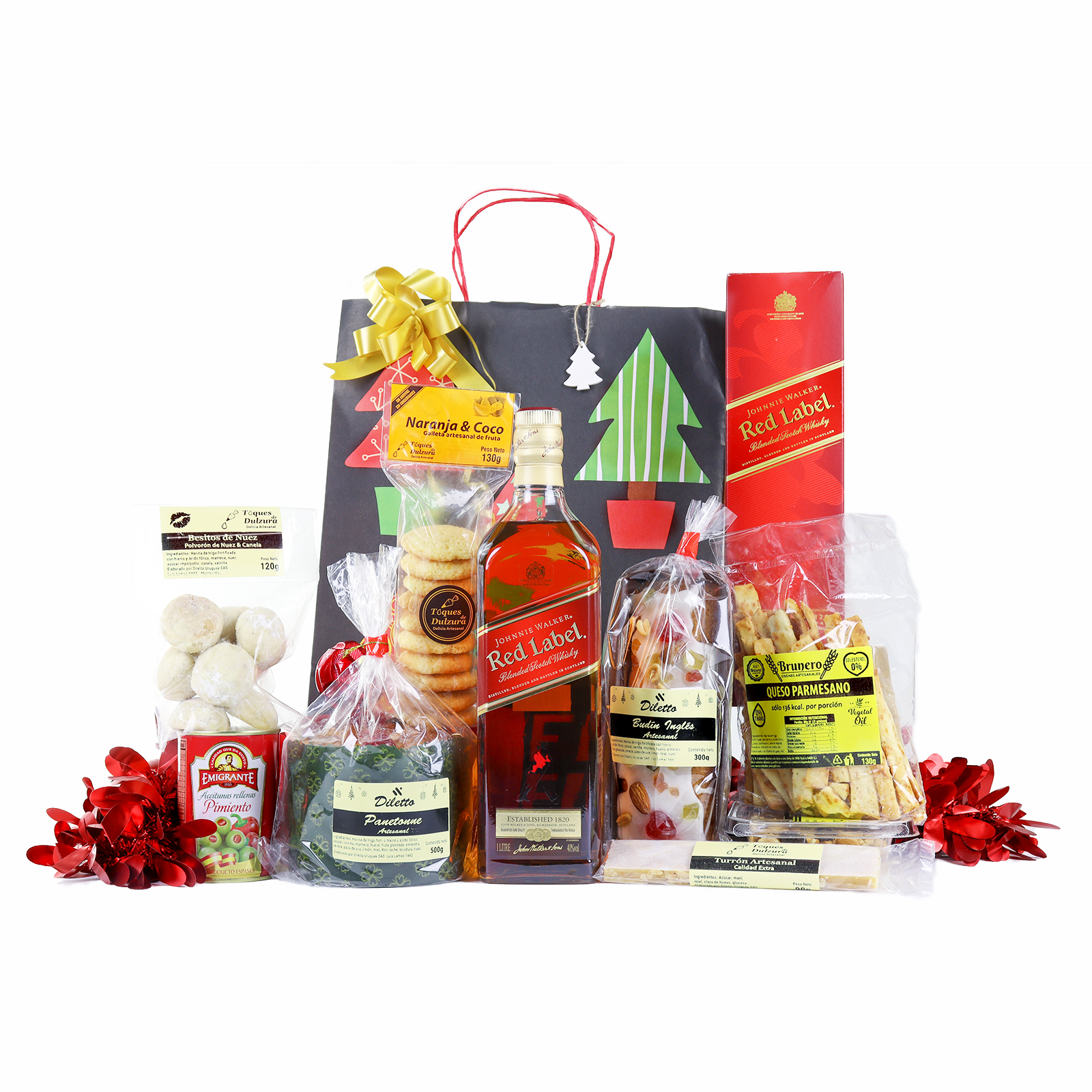 Incluye desde Panettone hasta Aceitunas Españolas, maridados perfectamente con Whisky Johnnie Walker Red Label. Presentación en bolsa ecológica con decoración festiva.