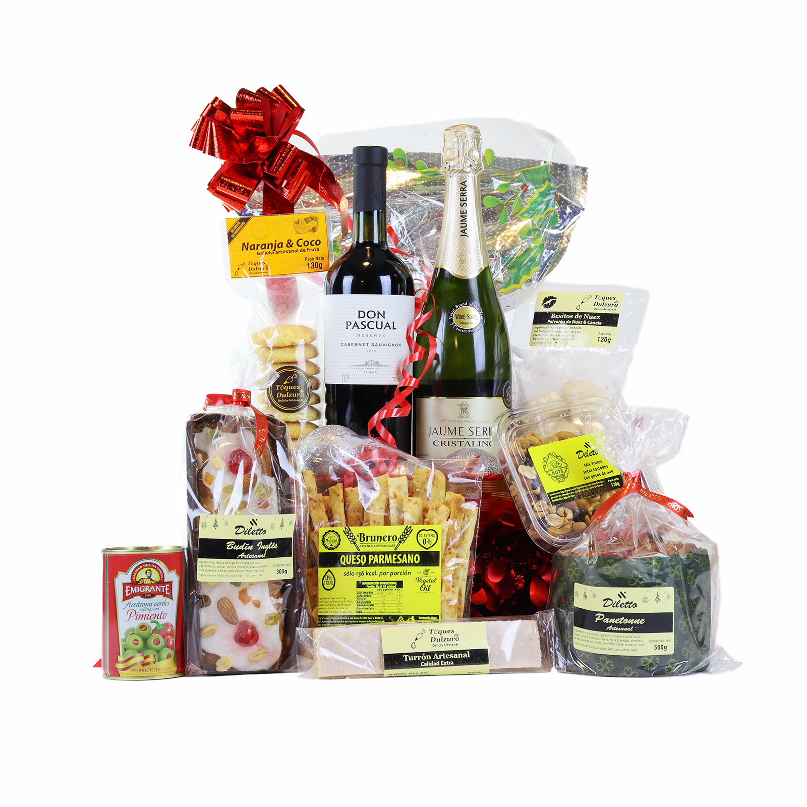 Sumérgete en los sabores de la temporada con el Panettone y el Budín Inglés Artesanal, el crujiente Turrón de Maní, y el toque gourmet de los Grisines con Tomates Secos & Albahaca y las Galletas Naranja & Coco. Los Polvorones de Nuez y Canela y el Mix de Frutos Secos junto con las Aceitunas Españolas rellenas, completan esta experiencia culinaria inigualable.