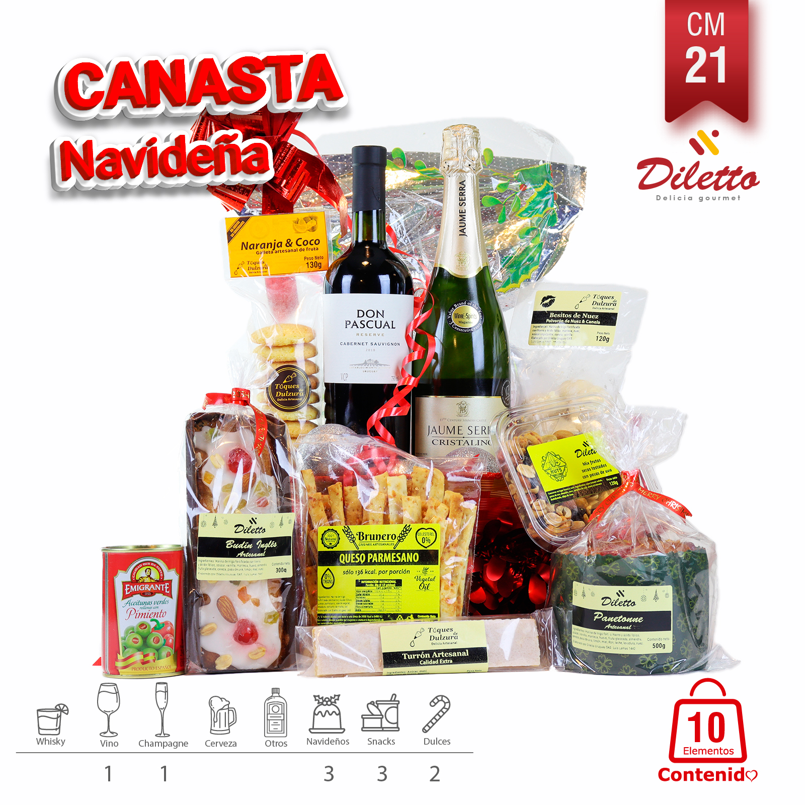 Explora la magia navideña con la Canasta CM21, una selección exquisita de Champagne Castelfino y Vino Cabernet Sauvignon Don Pascual, acompañados de delicias artesanales. Perfecta para un regalo que combina sabor y tradición.
