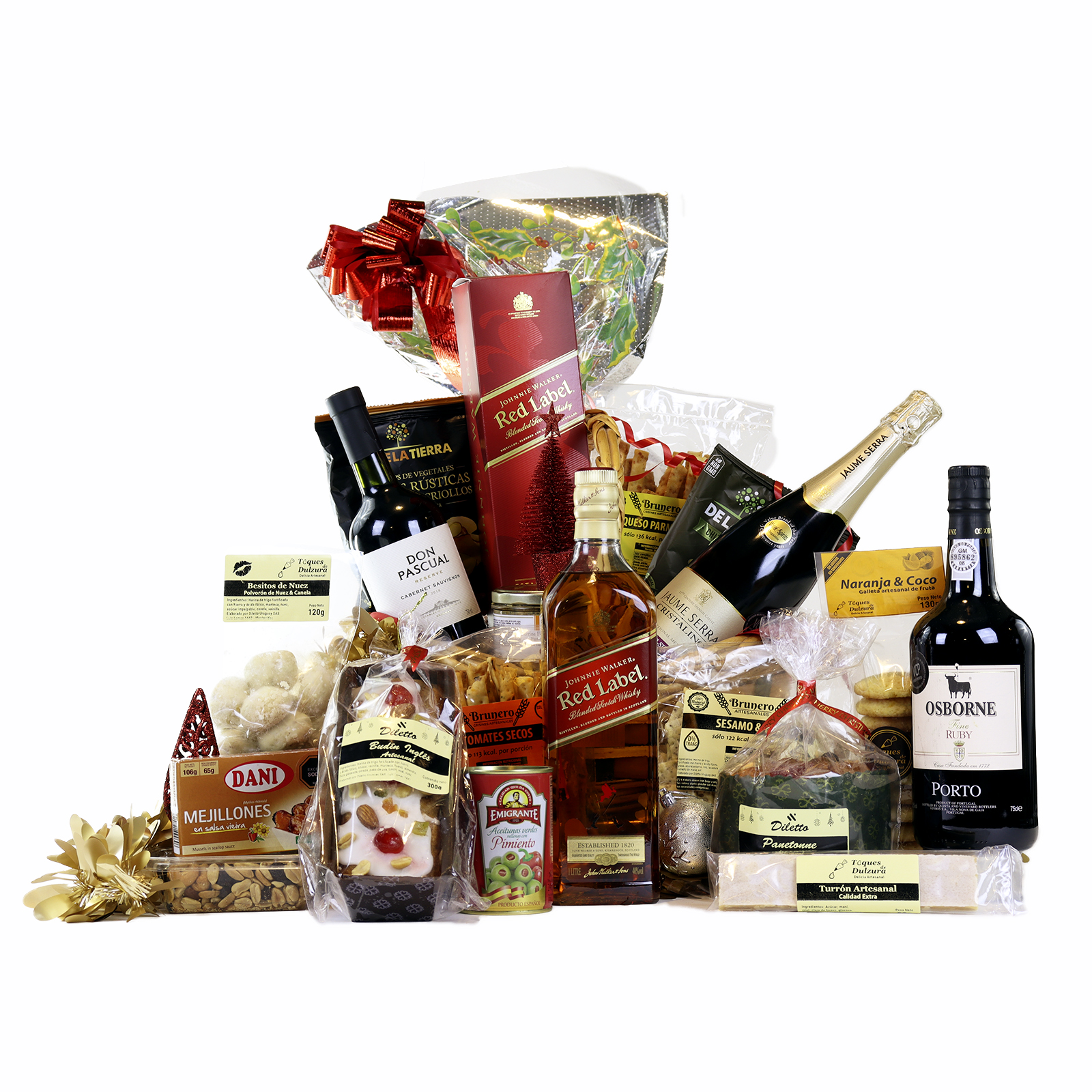La canasta incluye Whisky Johnnie Walker Red Label, Champagne Castelfino Cava Brut, Vino Cabernet Sauvignon Don Pascual Reserve, y el exquisito Jerez Oporto Osborne Ruby, destacando la calidad y el renombre de estas bebidas.