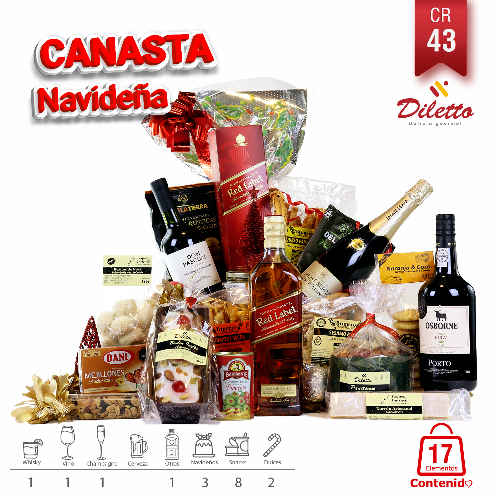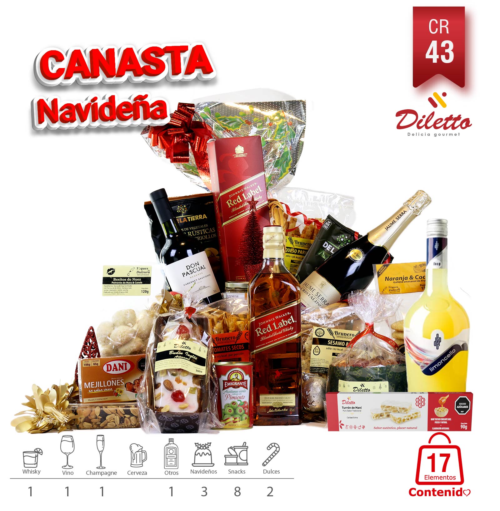 Descubre la Canasta Navideña CR43, un deleite de sabores con Whisky Johnnie Walker y Champagne Castelfino, complementados por una variedad de turrones y delicias artesanales, ideales para una celebración navideña de lujo.