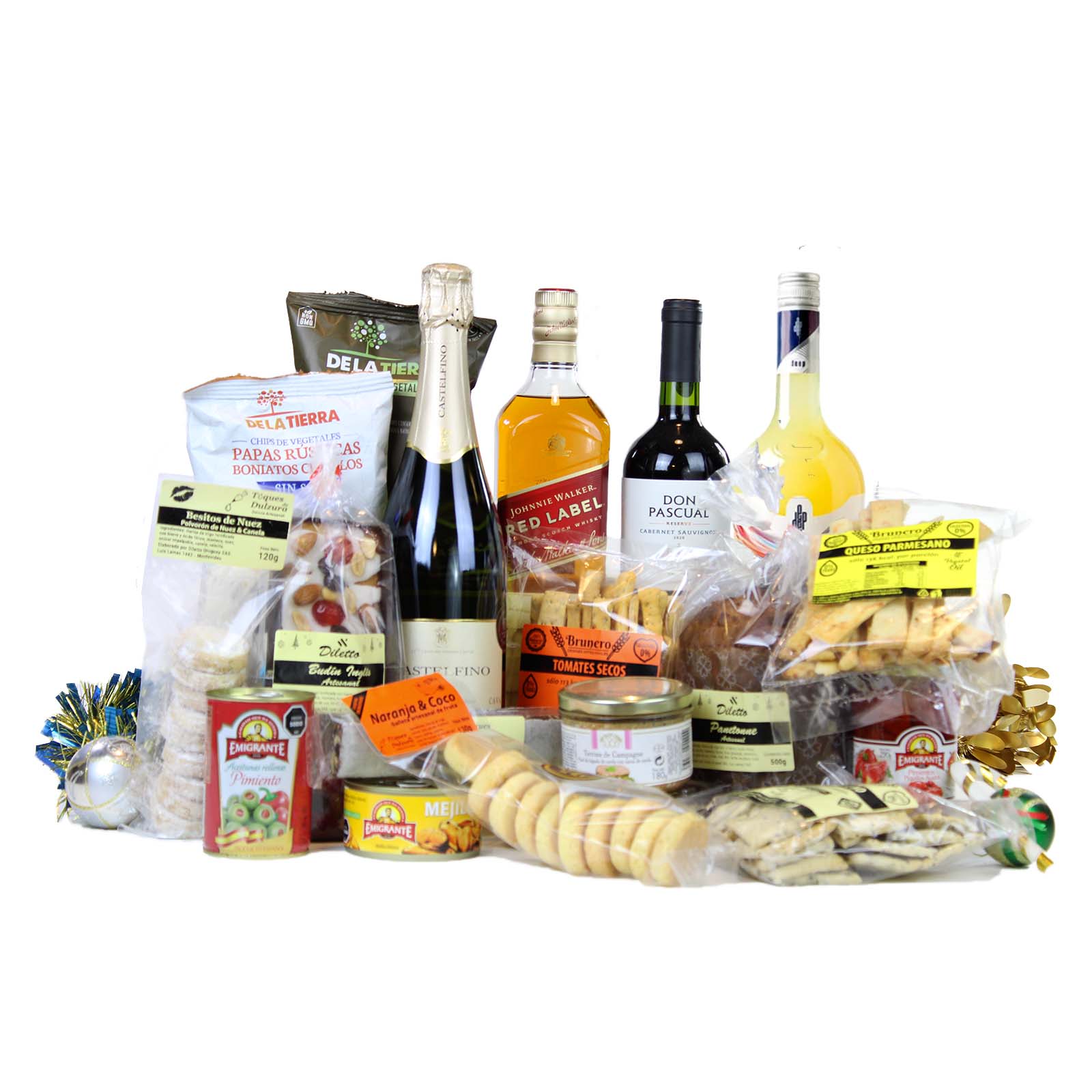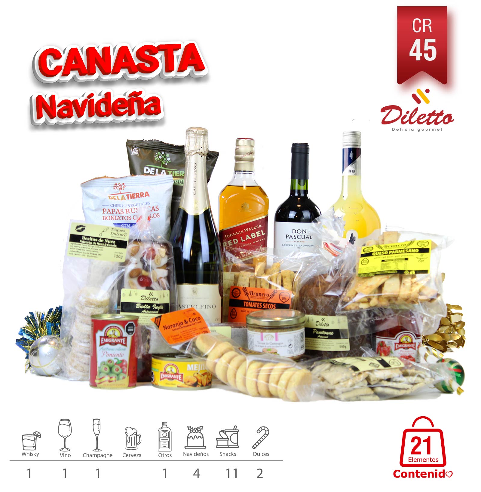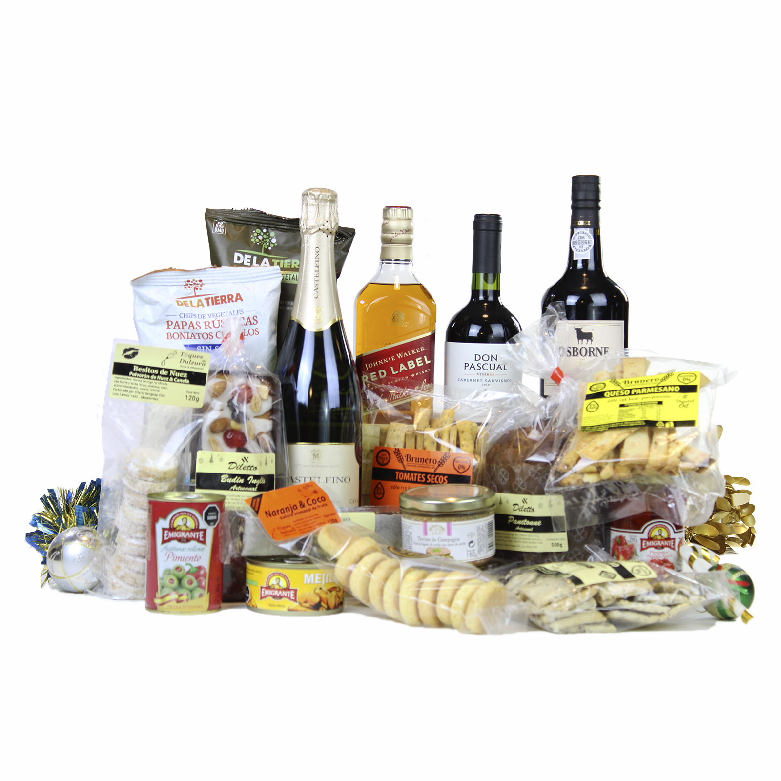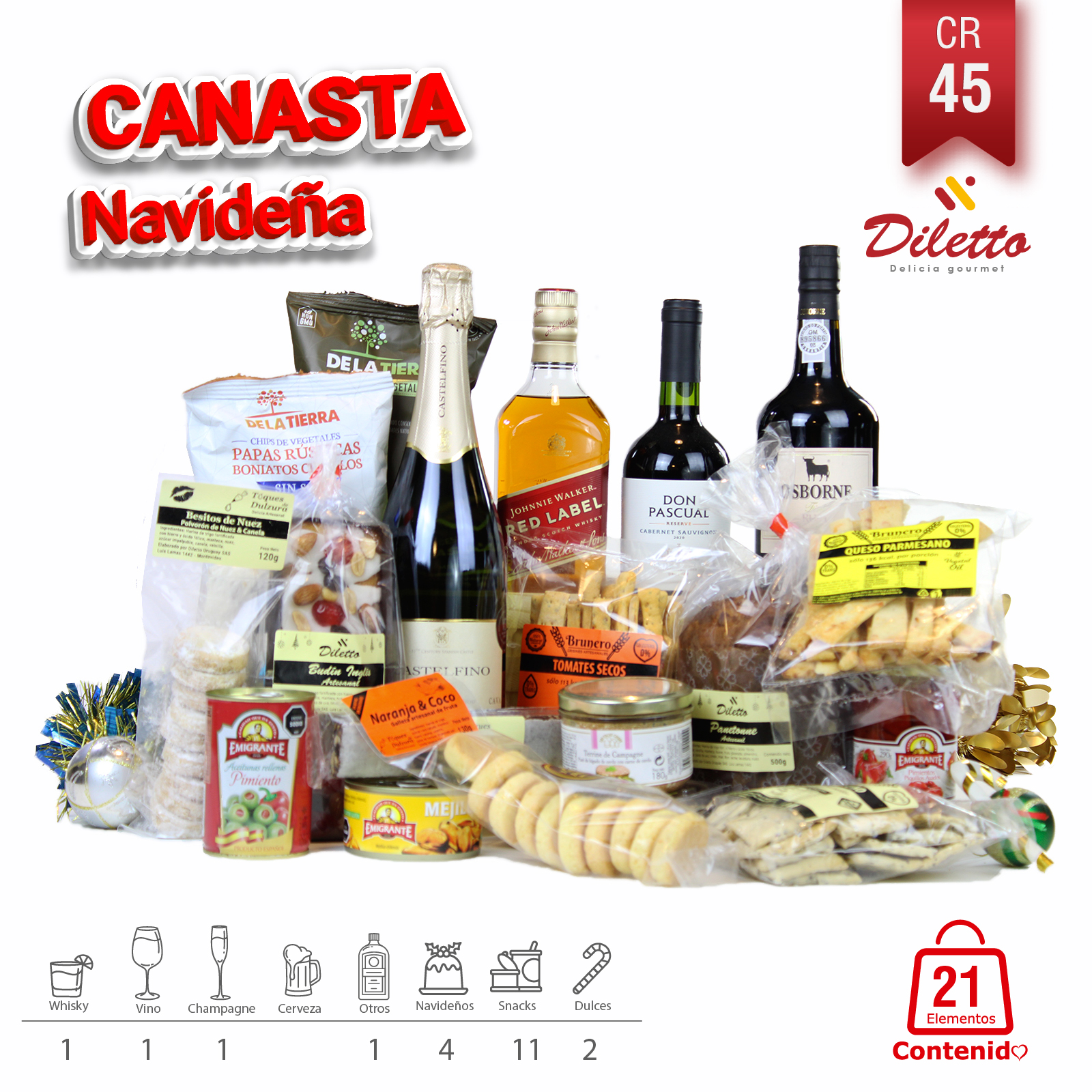 La Canasta Navideña CR45 inicia un viaje sensorial con el Whisky Johnnie Walker Red Label (1 litro) y el Champagne Castelfino Cava Brut (750ml). Descubre el Vino Cabernet Sauvignon Don Pascual Reserve y el Jerez Oporto Osborne Ruby, ambos de 750 ml, ofreciendo una experiencia vinícola única.