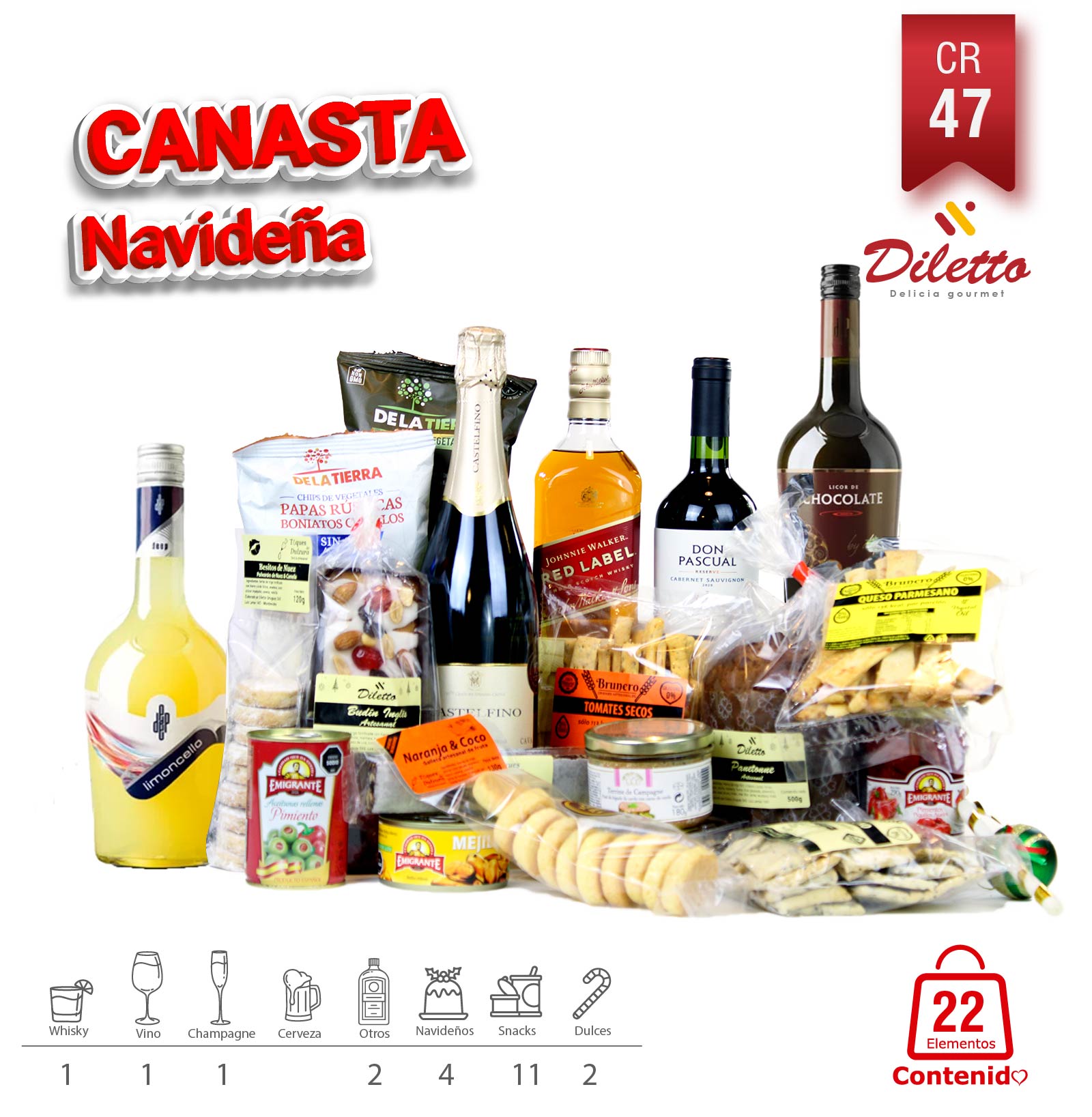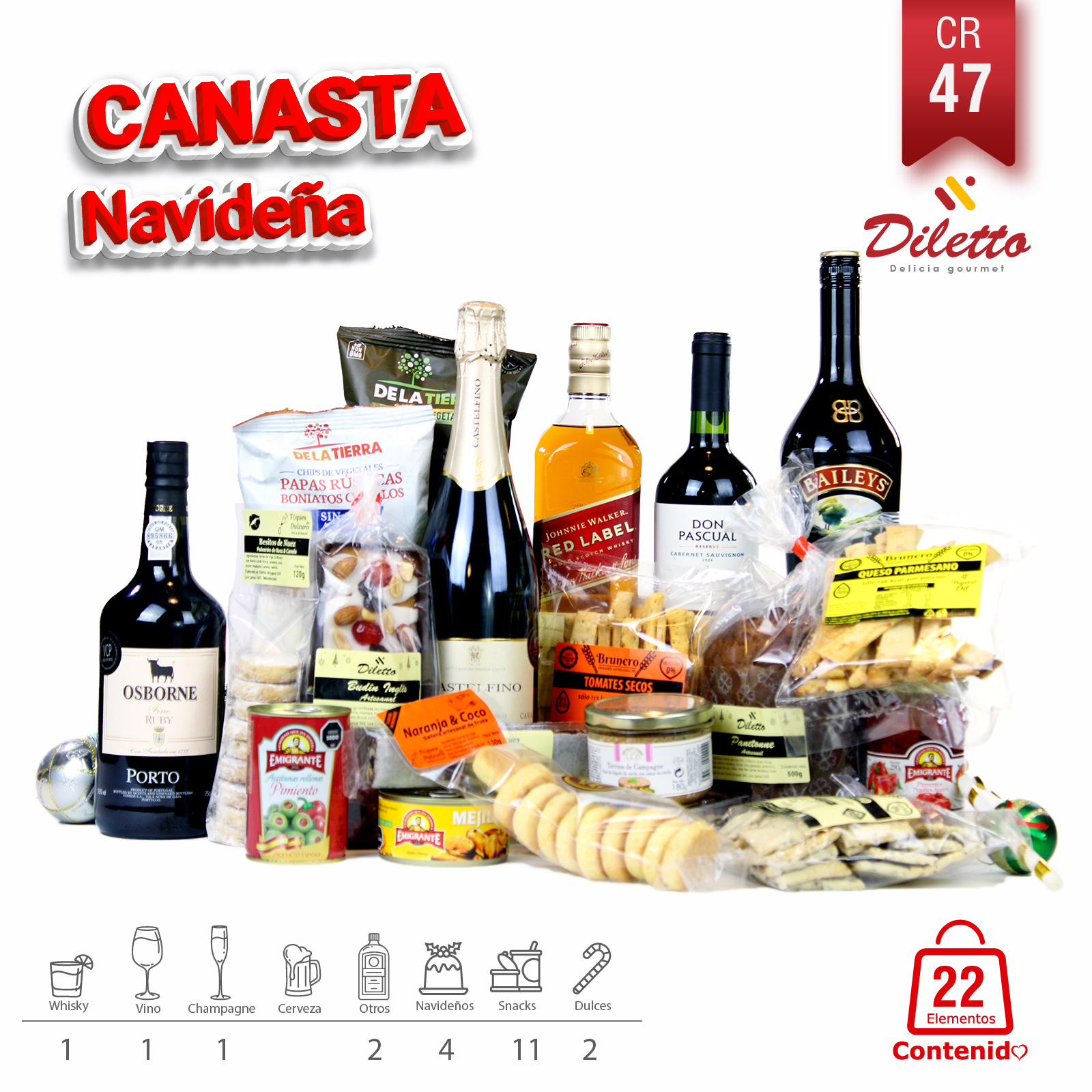La Canasta Navideña CR47 brinda una experiencia de sabor única, combinando licores selectos como el Whisky Johnnie Walker Red Label y el Champagne Castelfino, con delicias artesanales para unas festividades llenas de tradición y calidad excepcional.