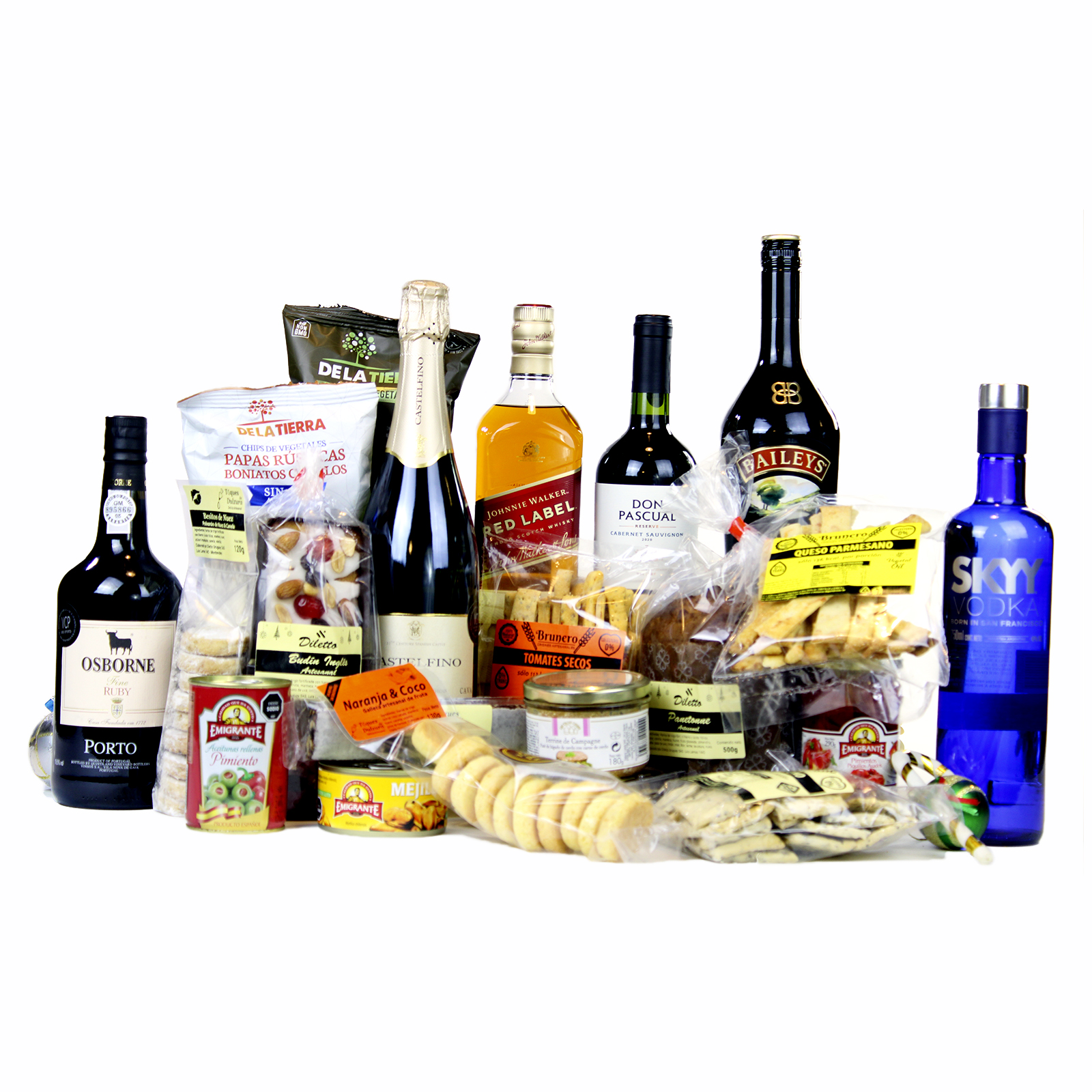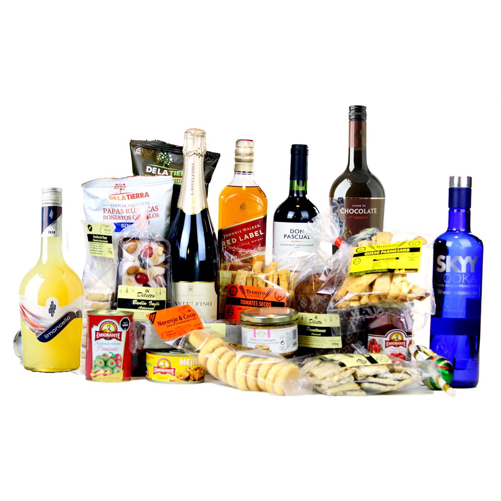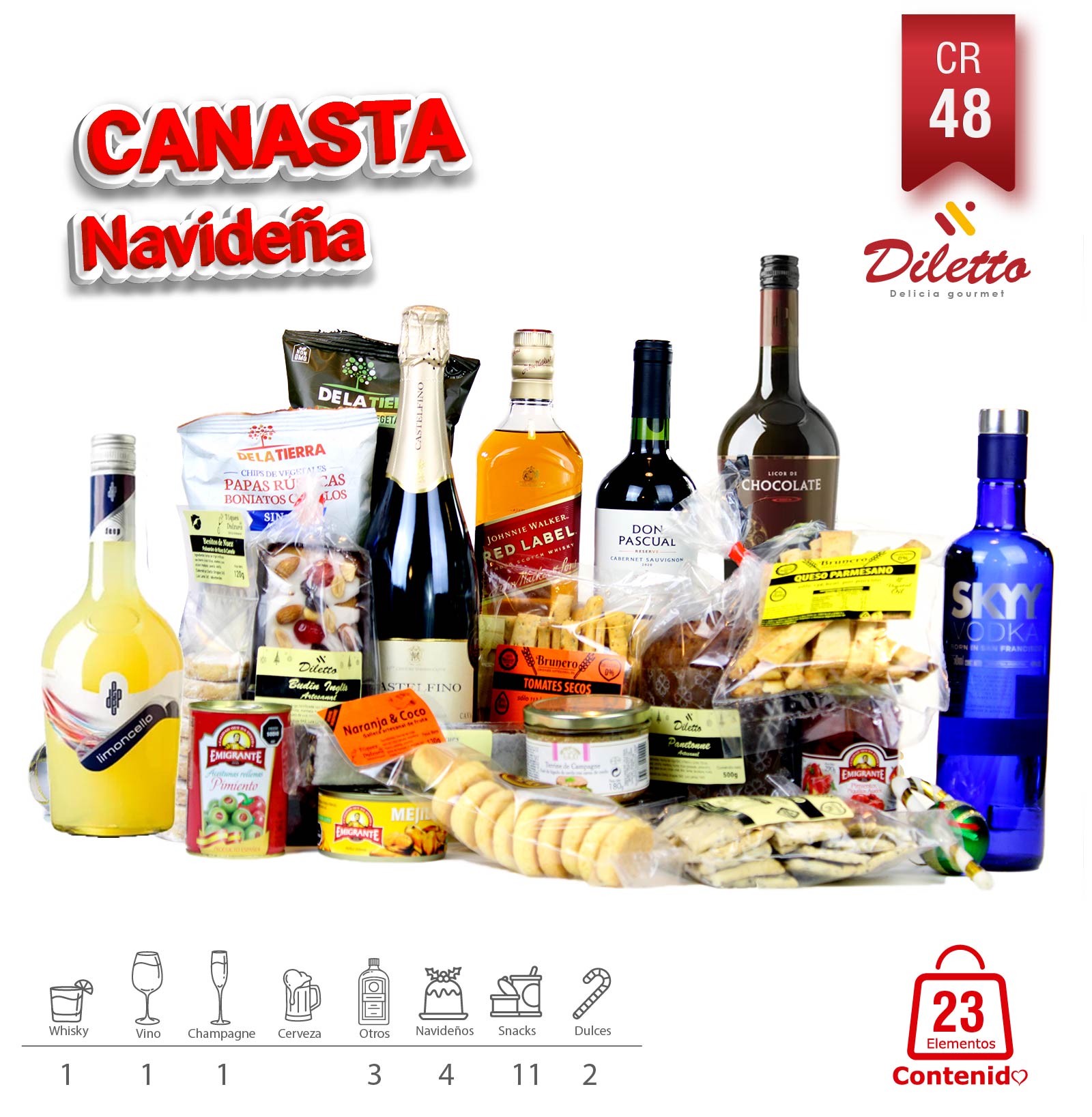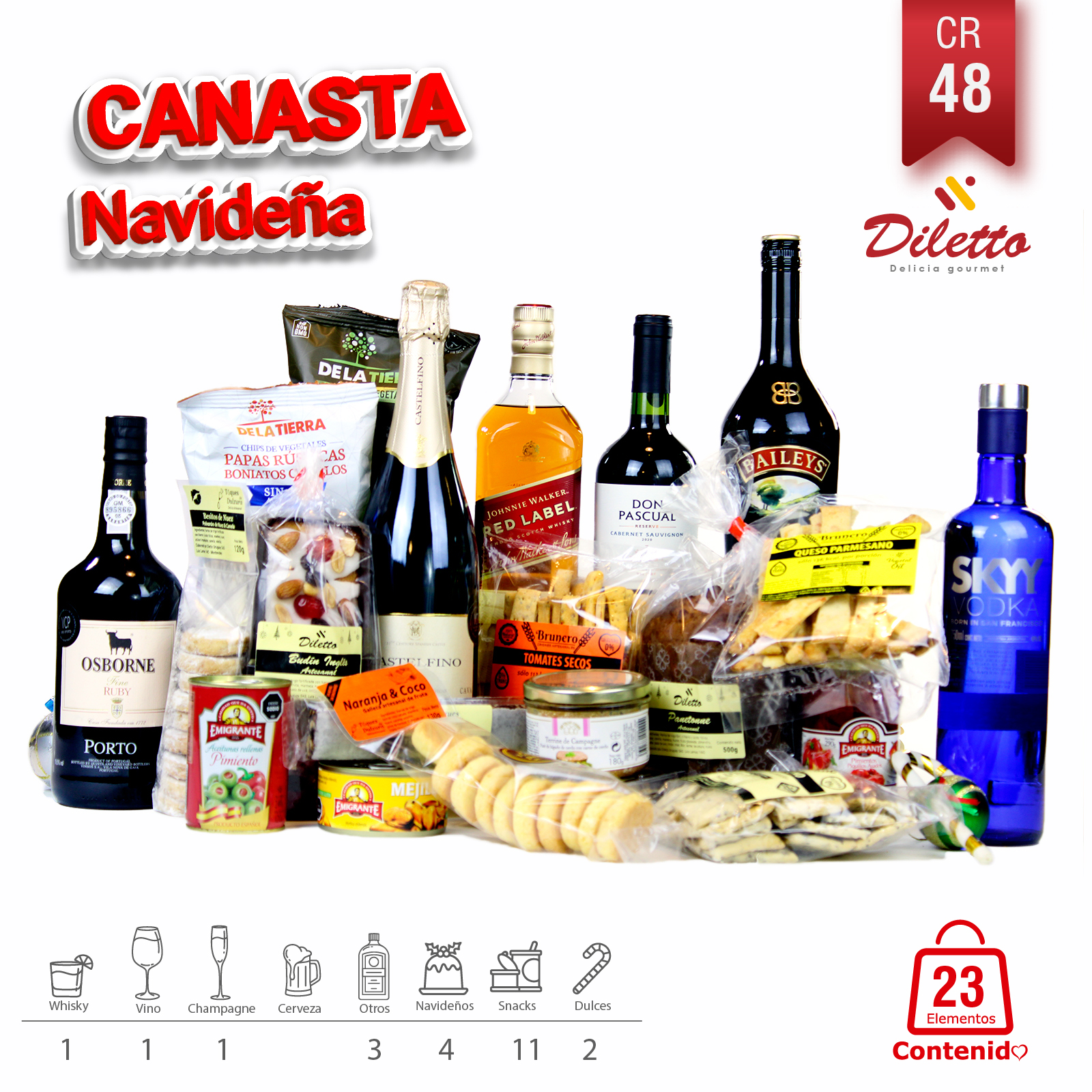 Descubre el mundo de sensaciones de la Canasta CR48 con el Whisky Johnnie Walker Red Label Scotch (1 litro) y el Champagne Castelfino Cava Brut (750ml). La colección se enriquece con el Vino Cabernet Sauvignon Don Pascual Reserve, el Licor Baileys Irlandés, y el Jerez Oporto Osborne Ruby Portugués, sumándose el Vodka Skyy para versatilidad en tus cócteles navideños.