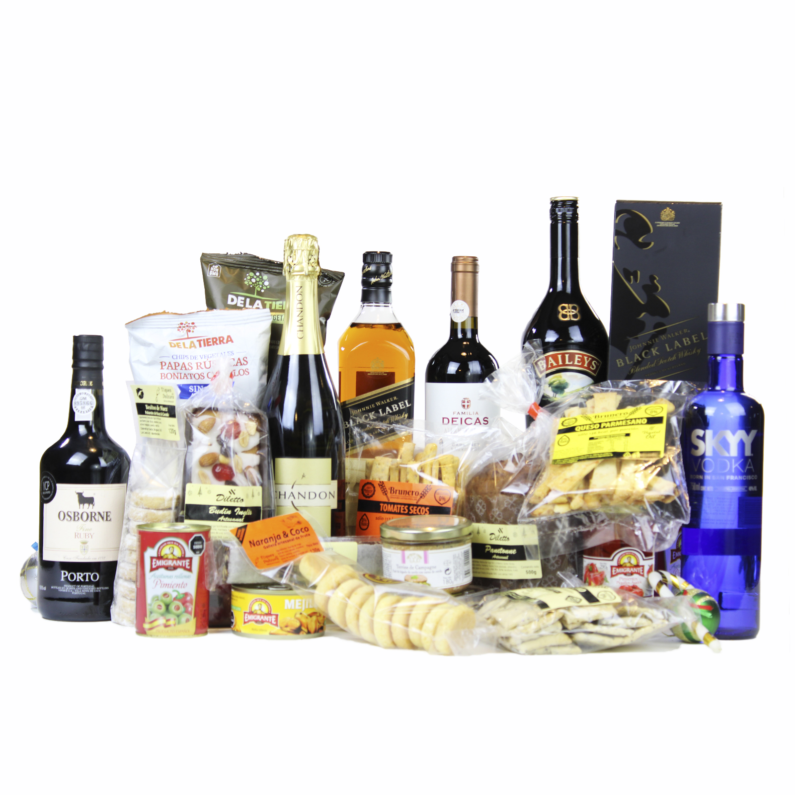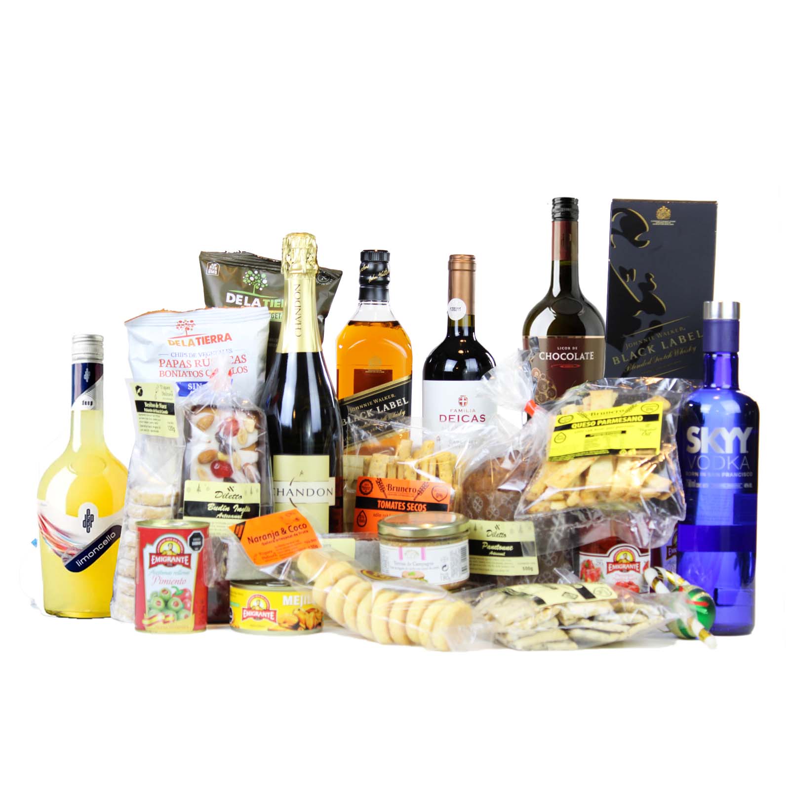Inicia un viaje de sabores con el Whisky Johnnie Walker Black Label Scotch (1 litro) y el distintivo Champagne Chandon Brut (750ml). La selección incluye Vino Cabernet Sauvignon Atlantico Familia Deicas, Licor Baileys Irlandés y Jerez Oporto Osborne Ruby Portugués, además del moderno Vodka Skyy, todos ideales para cócteles navideños.