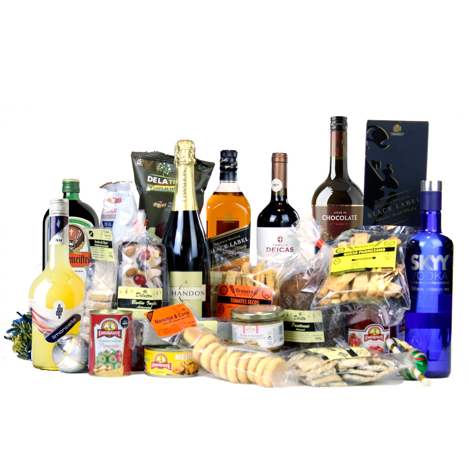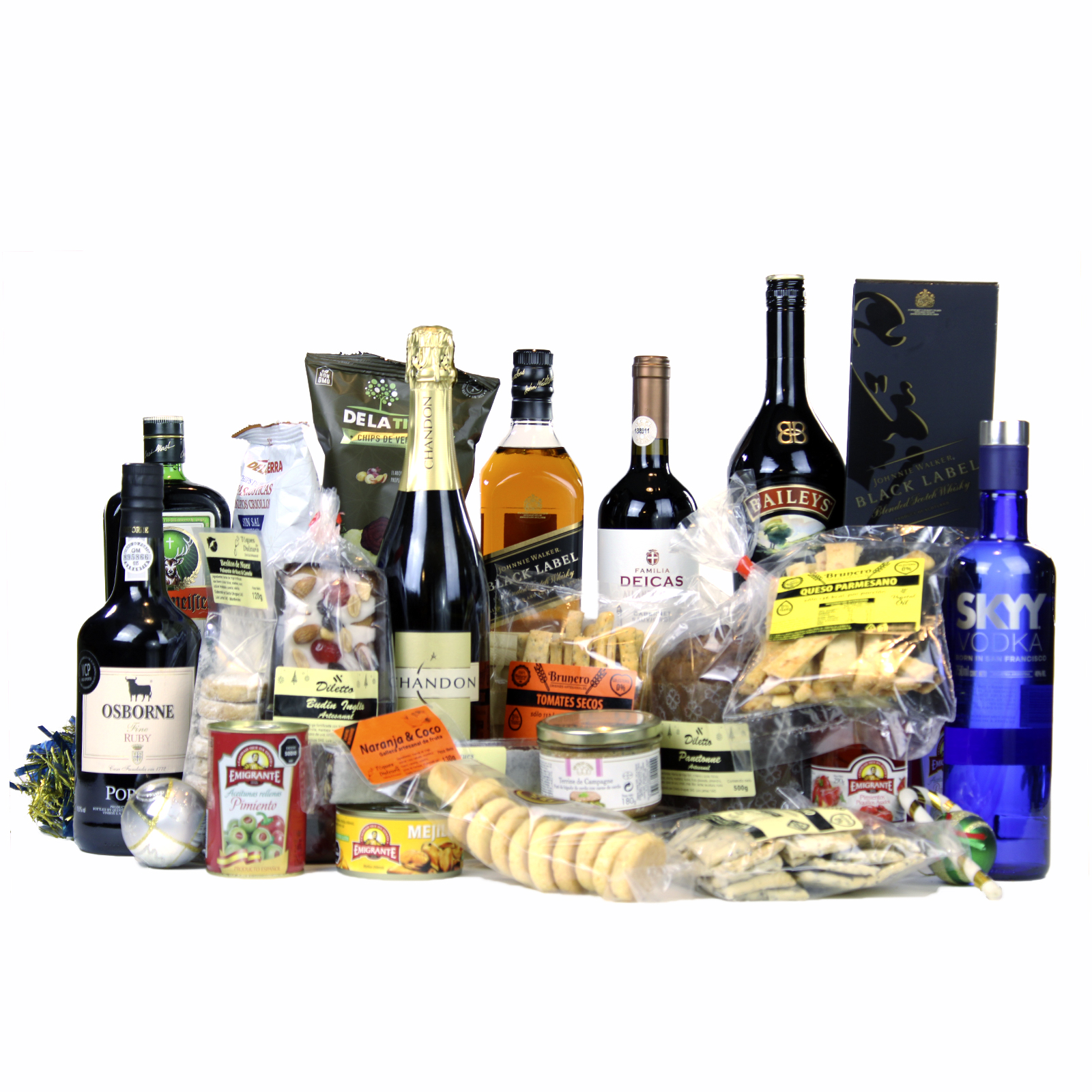 Disfruta de la elegancia del Whisky Johnnie Walker Black Label Scotch (1 litro) y del Champagne Chandon Brut (750ml). La canasta incluye Vino Cabernet Sauvignon Atlantico Familia Deicas, Licor Baileys Irlandés y Jerez Oporto Osborne Ruby Portugués, además del Vodka Skyy y el distintivo Licor Jagermeister.