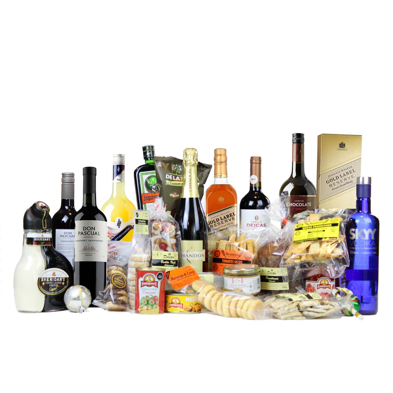 Descubre el corazón de la navidad con Whisky Johnnie Walker Doble Black Label Scotch (1 litro) y Champagne Chandon Brut, acompañados de vinos selectos como Cabernet Sauvignon Atlantico Familia Deicas y Pata Negra Roble Tempranillo. El toque distintivo lo aportan el Licor Baileys Irlandés, Jerez Oporto Osborne Ruby, Vodka Skyy y el especial Licor Sheridan’s Irlandés.